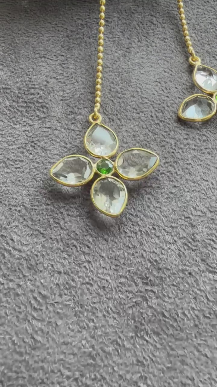Add a touch of elegance with these stunning long drop earrings, crafted in a radiant gold finish. The design features a sleek chain that flows into a delicate floral motif, highlighted by sparkling teardrop crystals and a rich green center stone. Lightweight yet eye-catching, these earrings beautifully blend modern grace with classic charm—perfect for both festive occasions and evening wear.